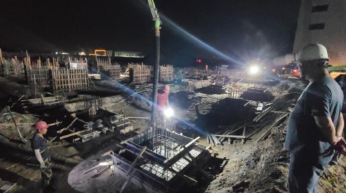 8月3日晚,建筑工程有限公司在鳴岐化工項目的施工現場一片忙碌。為搶抓施工黃金期,避開日間高溫影響,同時趕在大雨來臨前推進關鍵節(jié)點,項目部科學統(tǒng)籌,利用晚間進行施工作業(yè),集中澆筑罐區(qū)-罐組及泵棚基礎混凝土,總量達160立方。