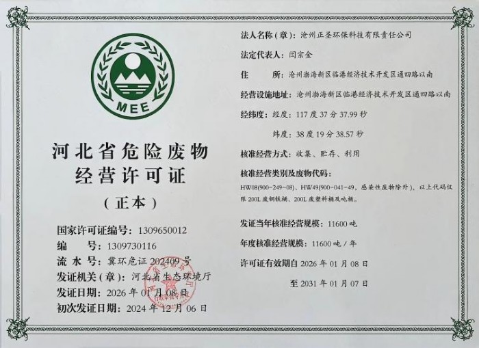 1月12日,滄州正圣環(huán)?萍加邢挢熑喂菊綇暮颖笔∩鷳B(tài)環(huán)境廳領取了新的《危險廢物經營許可證》,標志著其為期一年的臨時證照期滿,成功換發(fā)為有效期五年的正式許可證。